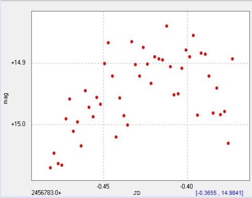 vsnet-alert17386で、発見が報告されていたASASSN-14cnを観測した。 14日に13.6等、16日に14.3等とのことでまだ明るいかと期待していたが、もう17等台と暗くなっていた。 暗い上に、雲が何度か通過したりして、特に変動のようなものは受からずライトカーブは…