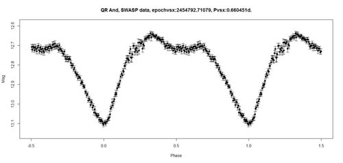 昨日のQR AndのPhave plotをVSXに載っている元期と周期で作りなおしたら、フェーズ0.0に極小がピッタリ収まりました。 というわけで、VSXのサイトに出ているEphemerisで極小時刻は正確なようです。 日本だと、今日ちょうど極小が観測できますね! Ephemeris …