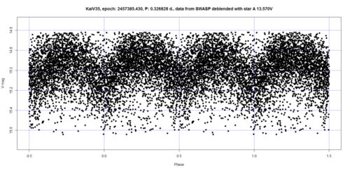 KaiV35のSWASPデータには他の星、AやBの光が混入しているようなので、それらの光の分を引き算して補正しなければなりません。(deblendというらしい。blendがまぜるだから、それを分けるとでも言うことでしょうか。) ところが、KaiV35のSWASPのデータをまず…
