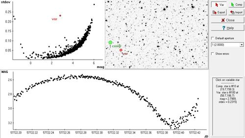 一昨日の夜、これらの二つの星を7時間ほど観測できて一応周期を求めてみました。 KaiV53はEAで、11月3日の観測から周期は0.5強と推定できていましたが、2回の観測からはっきりしました。 光度は比較星(13.048V)との差等級です。なので16等から17等あたりで…