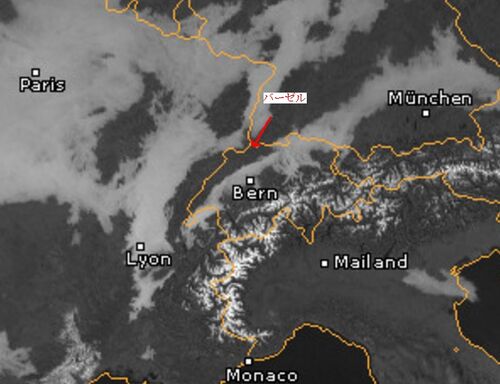 アルプスより北側のヨーロッパの冬の天気は、しばしば霧が発生して高気圧が来ていても空はグレーになります。 気象衛星による今のスイス付近の様子です。白いのが霧です。 バーゼル付近は南西から北東にのびて帯状に霧がないのがわかります。アルプスの雪も…