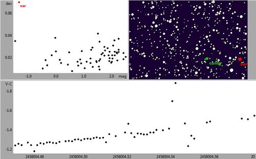 新変光星かと思ったらもう登録されていた! 一昨晩、7日夜、例のごとくKaiV57付近の観測をしたら、雲が通過してオートガイドは星を探してウロウロ。別の星野を撮影していました。かなり枚数があるのでそこで変光星探しをやってみました。 かなり明るい星で…