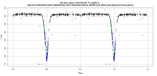 自分でやった観測はホンの僅かですが、乗りかかった船、MT Gemのいろんなデータを探し出して位相図に詰め込みました。 まず、AAVSOでMNICの略称の人が2016年にどうやって極小を当てたのか、第一極小を観測していました。(観測データはそれ一回のみ)ただ、…